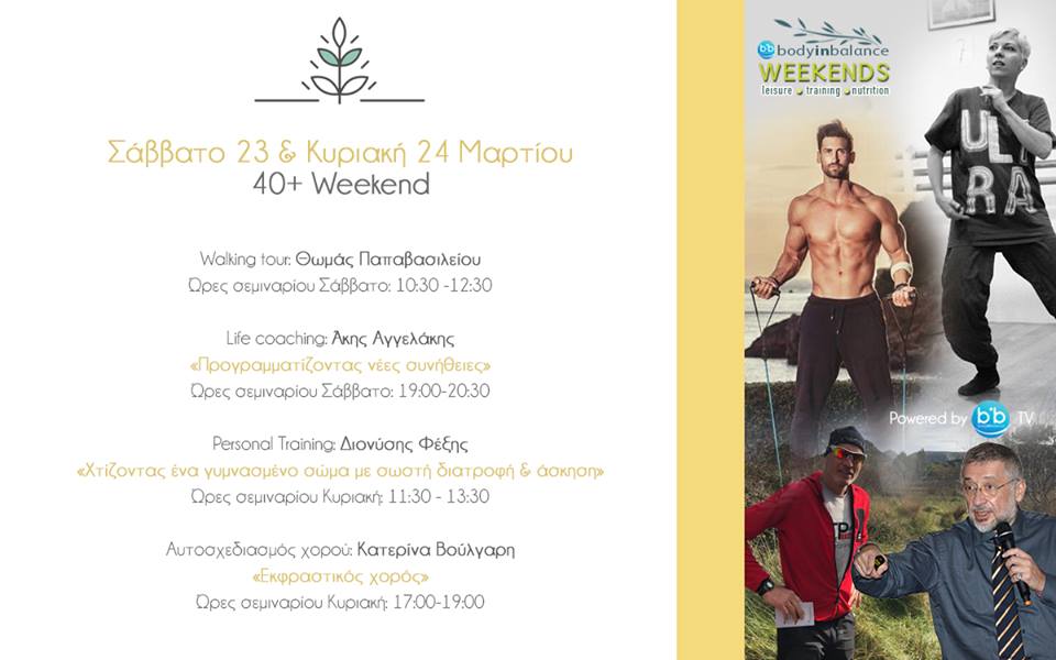 Το 40 + weekend, στις 23 και 24 Μαρτίου περιλαμβάνει δράσεις για να διατηρούμαστε ακμαίοι και ζωντανοί και μετά τα 40 μας χρόνια! Θα περπατήσουμε στη φύση της Βραυρώνας και θα γυμνάσουμε το σώμα αλλά και το μυαλό μας με personal trainer, ενώ θα εκφραστούμε μέσω του χορού για να έχουμε body in balance.