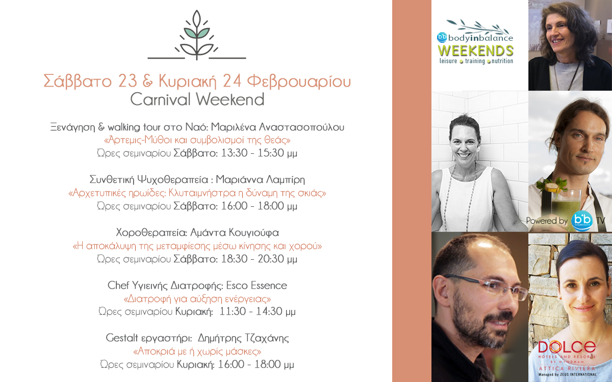 Ξεκίνησε το Τριώδιο και ετοιμαζόμαστε για αποκριάτικη ατμόσφαιρα που έχει τις ρίζες της στην αρχαιότητα. Εμείς στα Body in Balance weekends γιορτάζουμε την σημασία του καρναβαλιού στον ψυχισμό μας γι’ αυτό και ετοιμάσαμε σεμινάρια που μας φέρνουν κοντά σε αυτό που αποκαλούμε μάσκα και μυστήριο.
