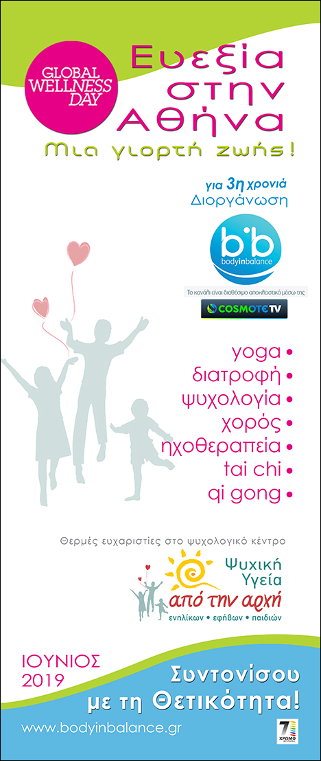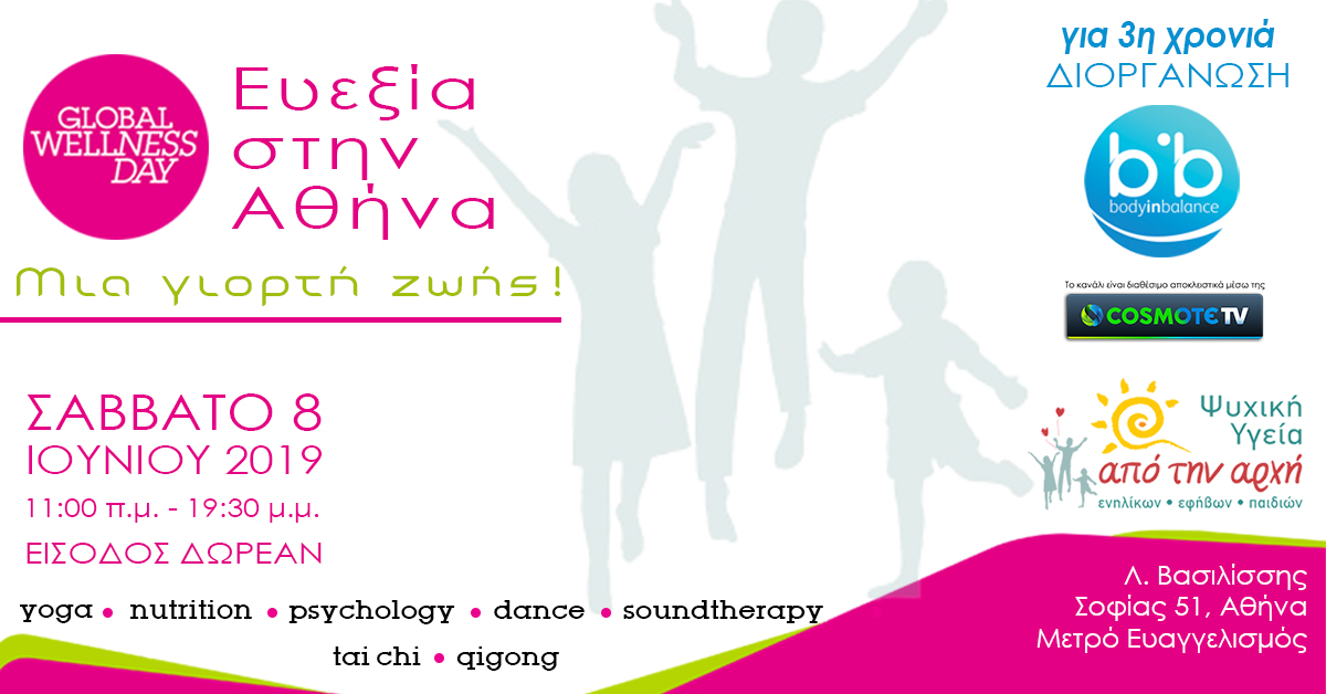 Στο πλαίσιο του εορτασμού της Παγκόσμιας Ημέρας Ευεξίας - Global Wellness Day που γιορτάζεται παράλληλα σε 130 χώρες, σε 5000 σημεία σε ολόκληρο τον κόσμο, το κανάλι ευεξίας που εκπέμπει αποκλειστικά στην Cosmote TV, Body in Balance Greece, ο επίσημος διοργανωτής του θεσμού αυτού στην Ελλάδα, πρόκειται να πάρει μέρος με μια ημερίδα για την ευεξία το Σάββατο 8 Ιουνίου στο Κολωνάκι και ανοιχτά μαθήματα yoga, stick fit-fun & χορού το απόγευμα της Κυριακής 9 Ιουνίου 2019, στο Γκάζι, αποδεικνύοντας περίτρανα ότι στο κέντρο της Αθήνας ακόμα χτυπά η καρδιά της ευεξίας!