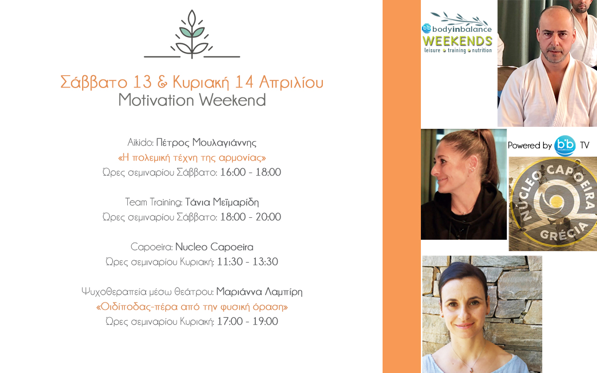 Στο Motivation Weekend 13-14 Απριλίου θα γνωρίσουμε εμδιαφέρουσες τεχνικές: Aikido με την Ομάδα του sensei Πέτρου Μουλαγιάννη και Nucleo Capoeira με δάσκαλο τον Chujosef Geraldo, που δίνουν δύναμη και ενεργοποιούν τον οργανισμό μας θετικά.