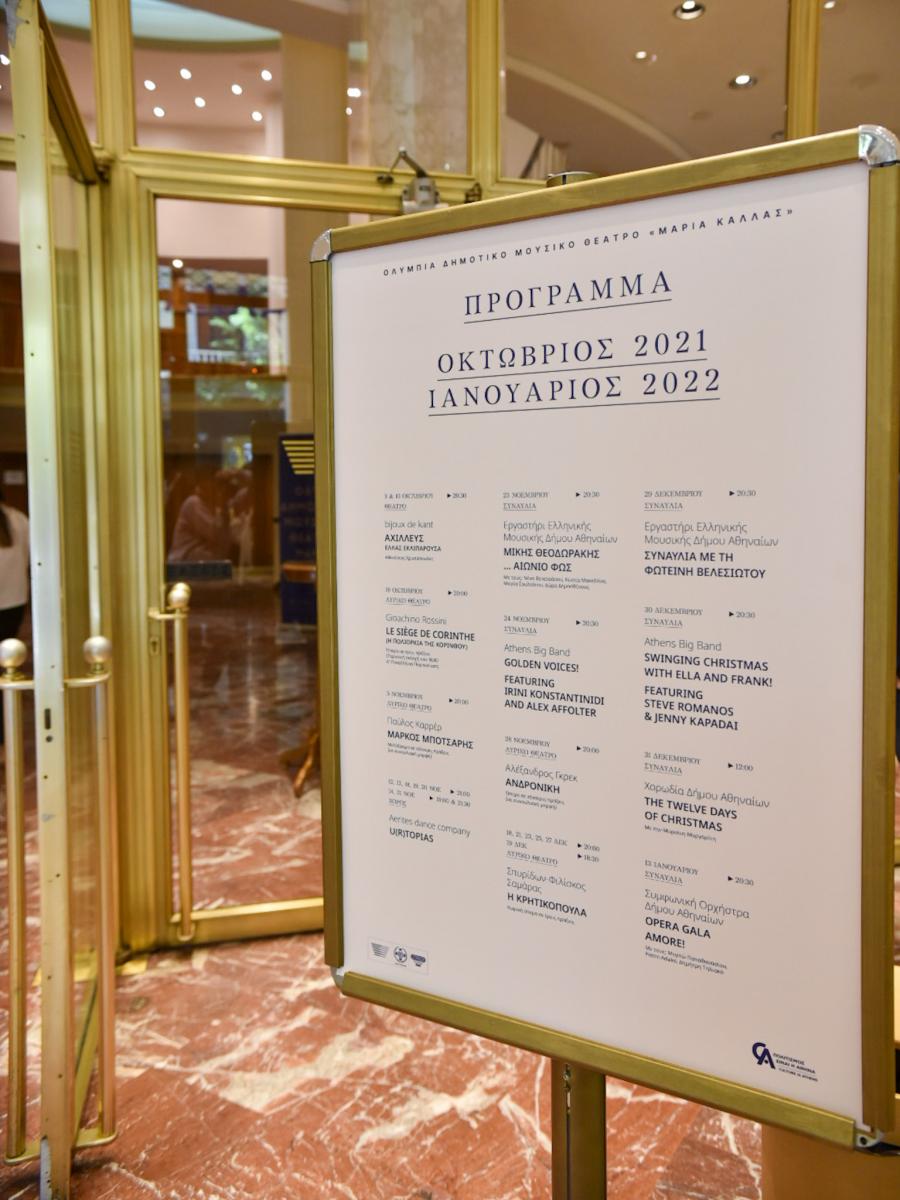 Τα φώτα ανάβουν και πάλι στο Ολύμπια Δημοτικό Μουσικό Θέατρο «Μαρία Κάλλας». Ο εμβληματικός χώρος πολιτισμού στην «καρδιά» της πόλης «συστήνεται» ξανά στους Αθηναίους, ενάμιση χρόνο μετά τη διακοπή της λειτουργίας του εξαιτίας της πανδημίας και σηκώνει αυλαία το ερχόμενο Σάββατο 9 Οκτωβρίου, με ένα πλούσιο πρόγραμμα καλλιτεχνικών παραστάσεων, για την περίοδο 2021-2022.
